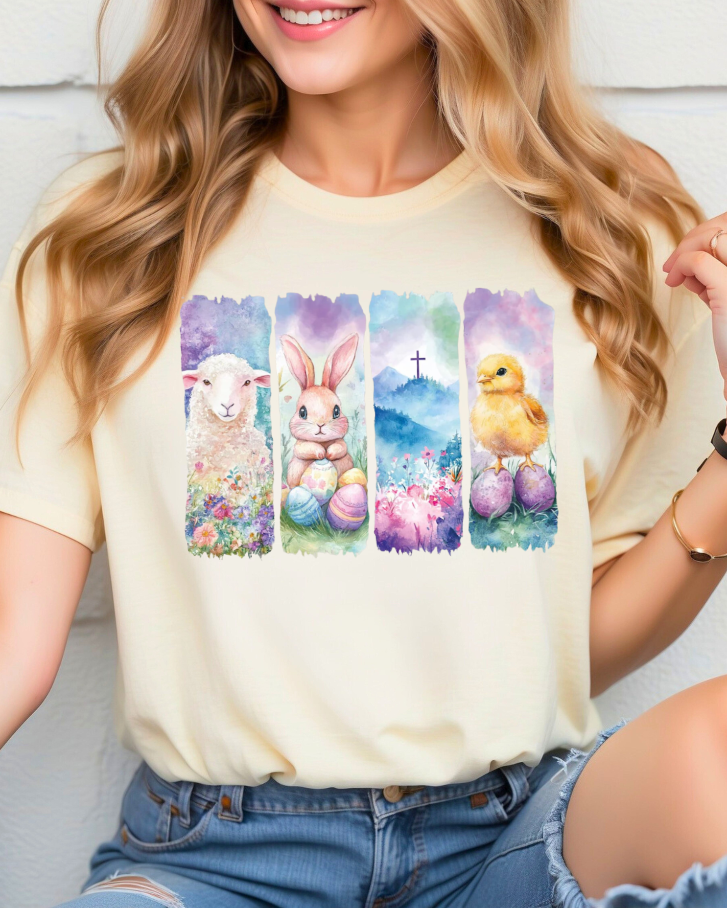 Our He Is Risen Easter Panel Tee features four hand-painted watercolor panels showcasing a lamb, bunny, cross, and chick — creating a peaceful, pastel Easter design perfect for church, brunch, and spring gatherings.