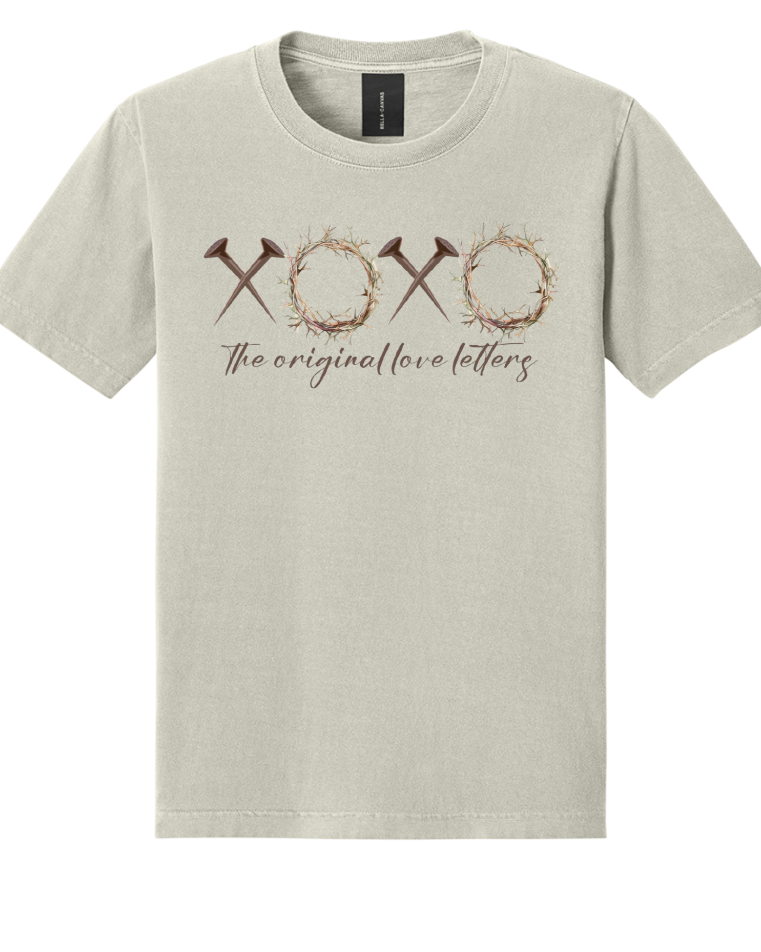 Featuring a crown of thorns “XOXO” design with subtle nail details and the phrase “The Original Love Letters”, this tee represents Christ’s love story written for us — perfect for Valentine’s season, church wear, women’s ministry gifts, and everyday faith-forward style.